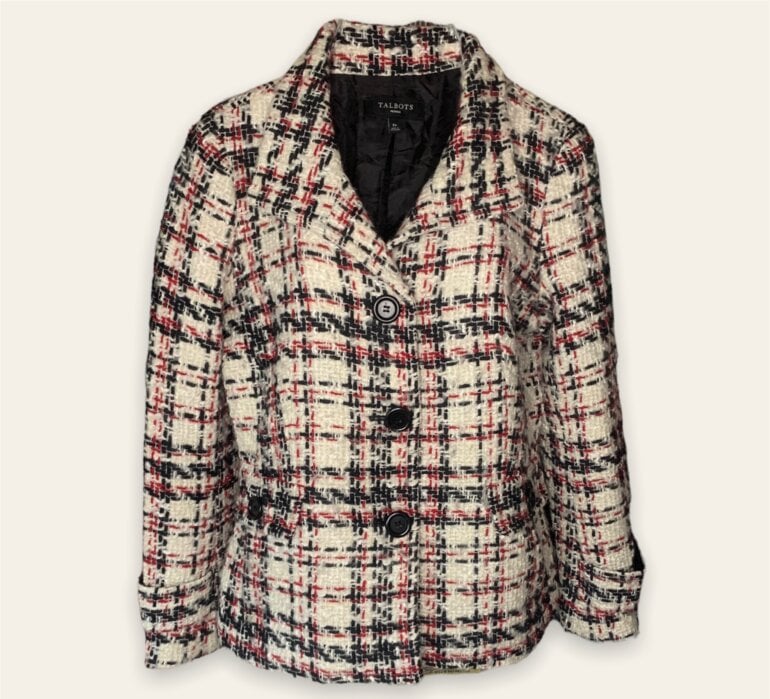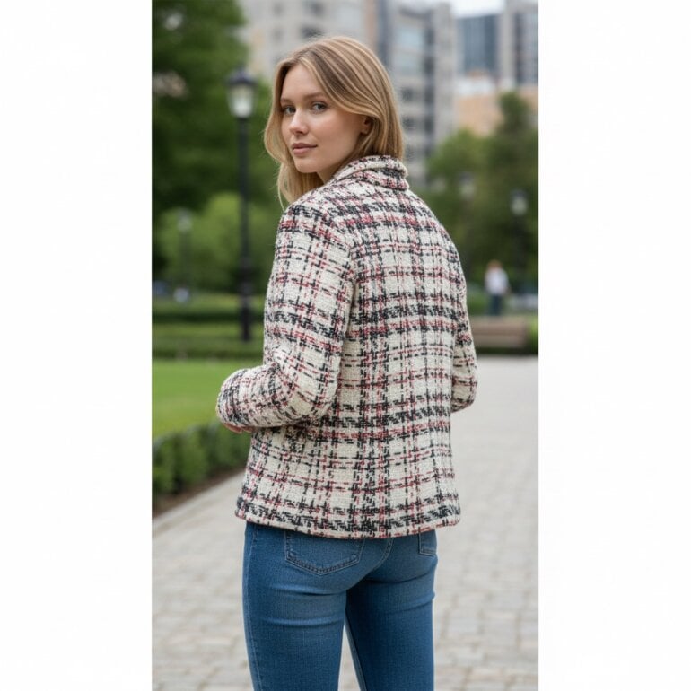 •Diseño en tweed, botones en relieve, solapas de muesca, cierre de tres botones, manga larga, puños con botón, dobladillo recto y forro completo