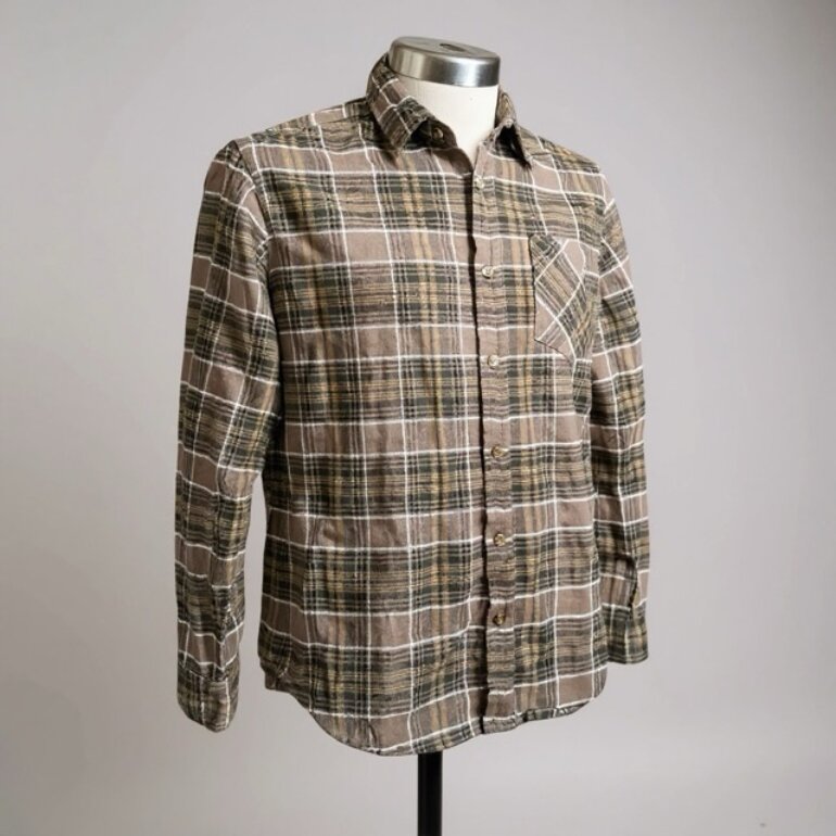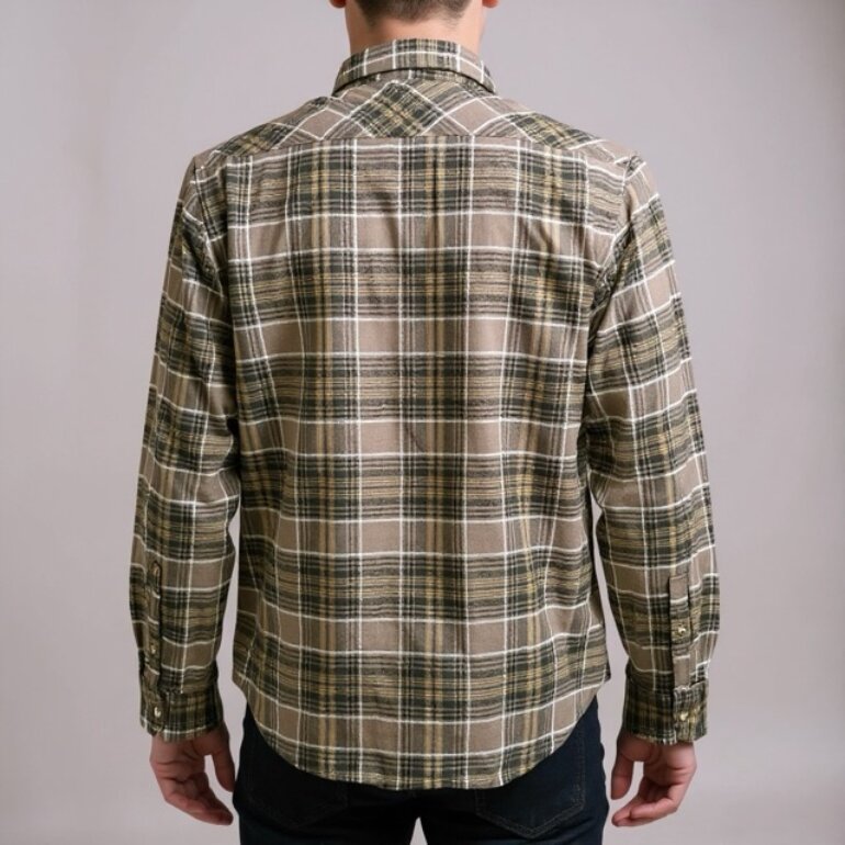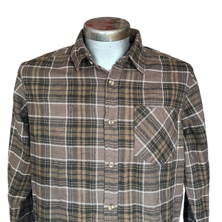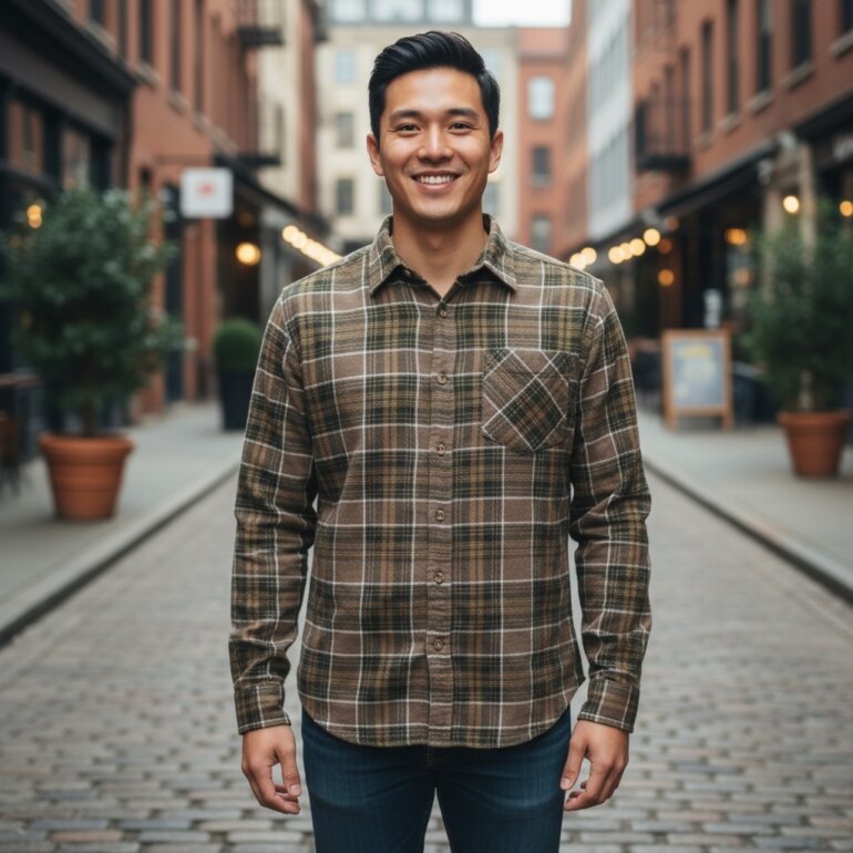 El diseño en cuadros marrón y beige aporta un toque clásico, mientras que la manga larga y el bolsillo frontal añaden funcionalidad y estilo. Perfecta para usar con jeans, pantalones casuales o incluso bermudas en climas más cálidos.